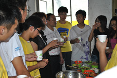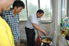 而后,杨院长和张书记亲自下厨为同学们准备丰盛的饭菜。张书记谈吐幽默,边切菜边与同学们说笑。天气炎热难耐,大家静坐着都会汗流浃背,杨院长依然继续在炉旁烹饪。汗水湿透了院长的衣襟,也湿透了搭在脖子上的毛巾。院长和蔼可亲,一边炒菜边与旁边的同学交谈,大家都十分高兴。宿舍虽小,饭桌简陋,大家只能站着吃饭,但欢笑声却萦绕在整个小屋里。饭间,三位领导以饮料带酒,给予实践团同学们鼓励和祝福。饭后,实践团同学陪同院领导一同来到兰陵现代学校前合影,依依不舍的与领导告别。正值酷暑,激动和自豪驱尽了大家心中的烦闷,生活艰苦,但乐观的心态让大家勇往直前。下乡虽苦,却体会到了其他人不易体会到的乐观和甘甜。