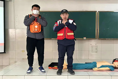 任海涛向大家讲述河南驰援等多次志愿服务经历,他说,体育人有强健的体魄、充沛的体力,在国家需要的时候我们应当贡献力量。大家要在学习与实践中练就本领、增长才干,在遇到危险与困难时,永不放弃、坚持不懈的体育精神与熟练的安全应急技能是有效抢险救人的制胜法宝。敖玉峰就安全应急理论学习和实践操作两个部分进行详细讲解,内容主要涉及应急救护基本知识、心肺复苏、气道异物梗阻、创伤现场救护等方面。在实践操作中,学生通过模型模拟心肺复苏及气道异物梗塞操作步骤,进一步夯实了急救能力。
