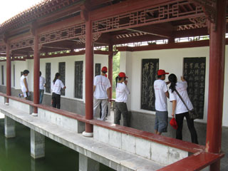 上午九点整,在老师的带领下,大家身着统一服装,步行来到曹州书画院进行参观学习。 漫步在文化长廊,流连于书画碑文,感受先人风采神韵,同学们徜徉在文字的海洋,乐在其中。菏泽乃牡丹之乡,碑文大多述说牡丹之美,虽说同学们对古文字的了解不足以读懂石碑之字,却也能在字里行间感受到先辈的赞赏之意。“国色天香”,一词足矣。