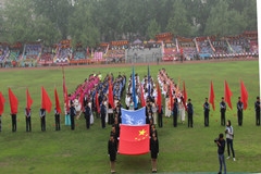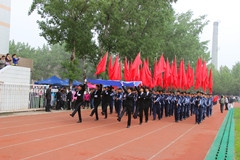 的护旗手手护国旗与校旗迈着坚实稳健的步伐从北边向主席台走来,每一个护旗手的脸上都面带微笑却又不失庄严与严肃。每一个步伐都是青春的印记,每一句口号都是发自内心的崇敬与渴望之情。裁判方队作为运动员成绩的裁决者,他们冷静公正,铁面无私。鲜花方队活力四射,花团锦簇。放眼望去,塑胶场地上,各学院方队像踏上征途的士兵,等待着检阅。每一个方队都有自己学院的风格和特色,各学院的良好的精神风貌表明了对2015年春季运动会的期待。走过主席台,队员们手持红旗,变换着不同的队形。开幕式精彩连连,为我们不断带来惊喜。